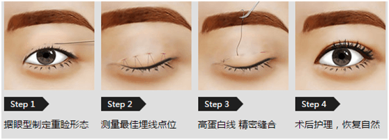通过缝合方式,直接把缝线(或高分子缝合线)埋藏于皮肤及睑板之间,使上睑皮肤同睑板发生粘连,形成重睑。