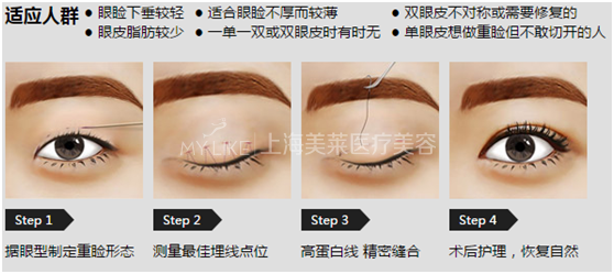 埋线法相对于切开法有很多优点,先是手术时间短、浮肿少、在术后可以立即出院,其次是愈合周期短。通常在术后的4到5天之后就可以恢复正常的日常生活,而在术后个月,浮肿的70%将消失并自然的眼部状态。