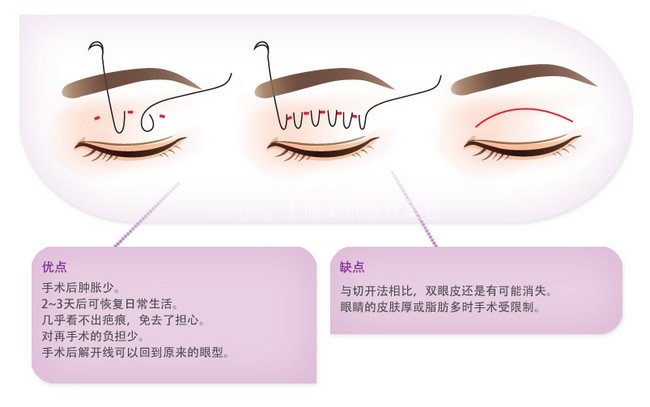 埋线法是手术操作创伤小的手术方法,是通过缝线连接皮肤与眼睑下组织而形成双眼皮皱褶。由于手术创伤小,其术后恢复时间快,通常1周内即可有效恢复自然,而且术后不会遗留瘢痕。但由于上睑的皮下组织未行充分的处理,所以部分患者在埋线后段时间双眼皮会再次消失。同时需要注意的是,埋线法重睑对自身上睑条件要求相对较高,适合本身上睑皮肤较紧致,皮下组织不臃肿的求美者。